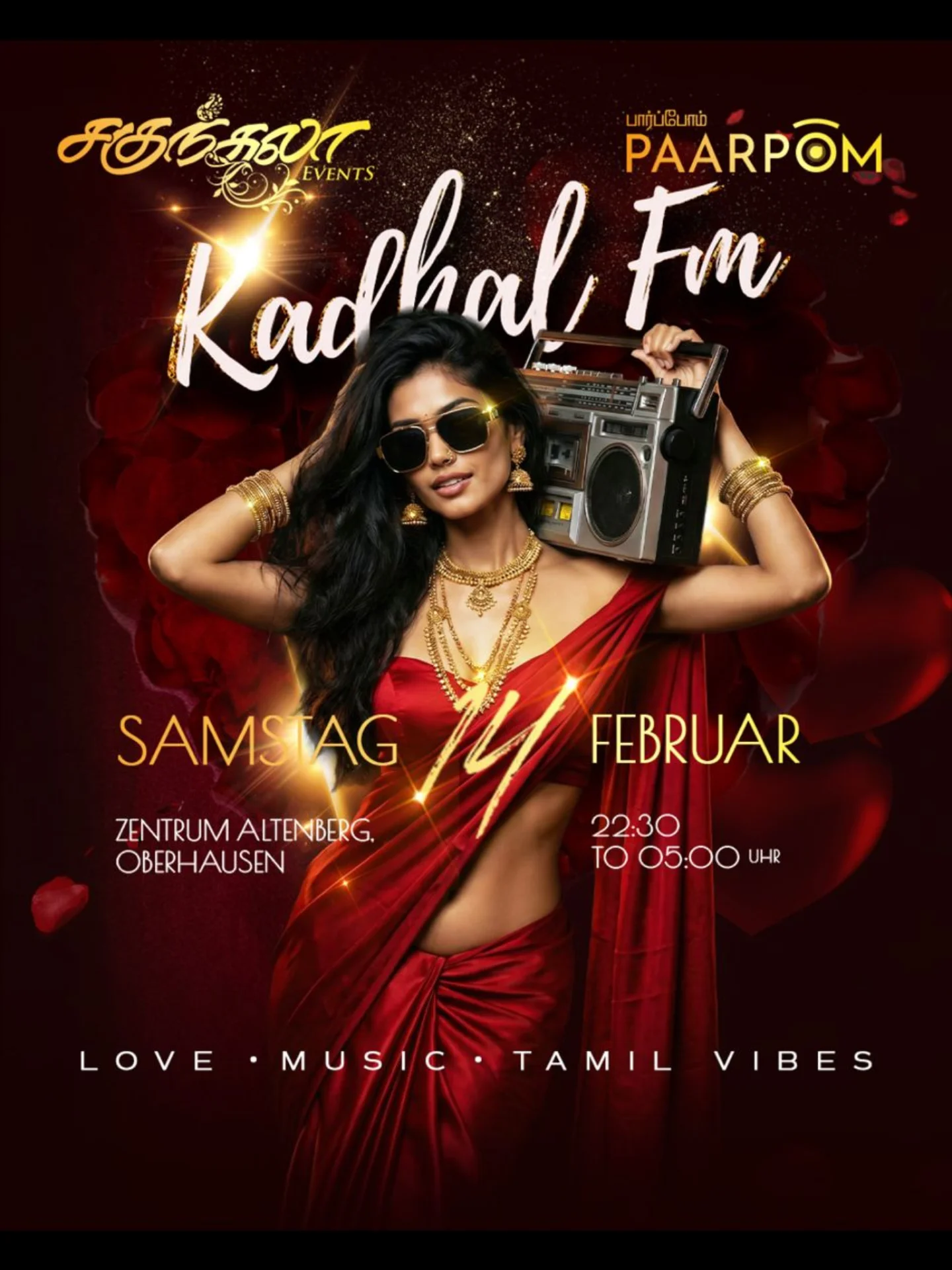 Celebrate Valentine's Day 2026 at KADHAL FM, the first Tamil club night in NRW! Join us in Oberhausen for love, music and unforgettable vibes. Feb 14, 23:00–05:00. Tickets online only.