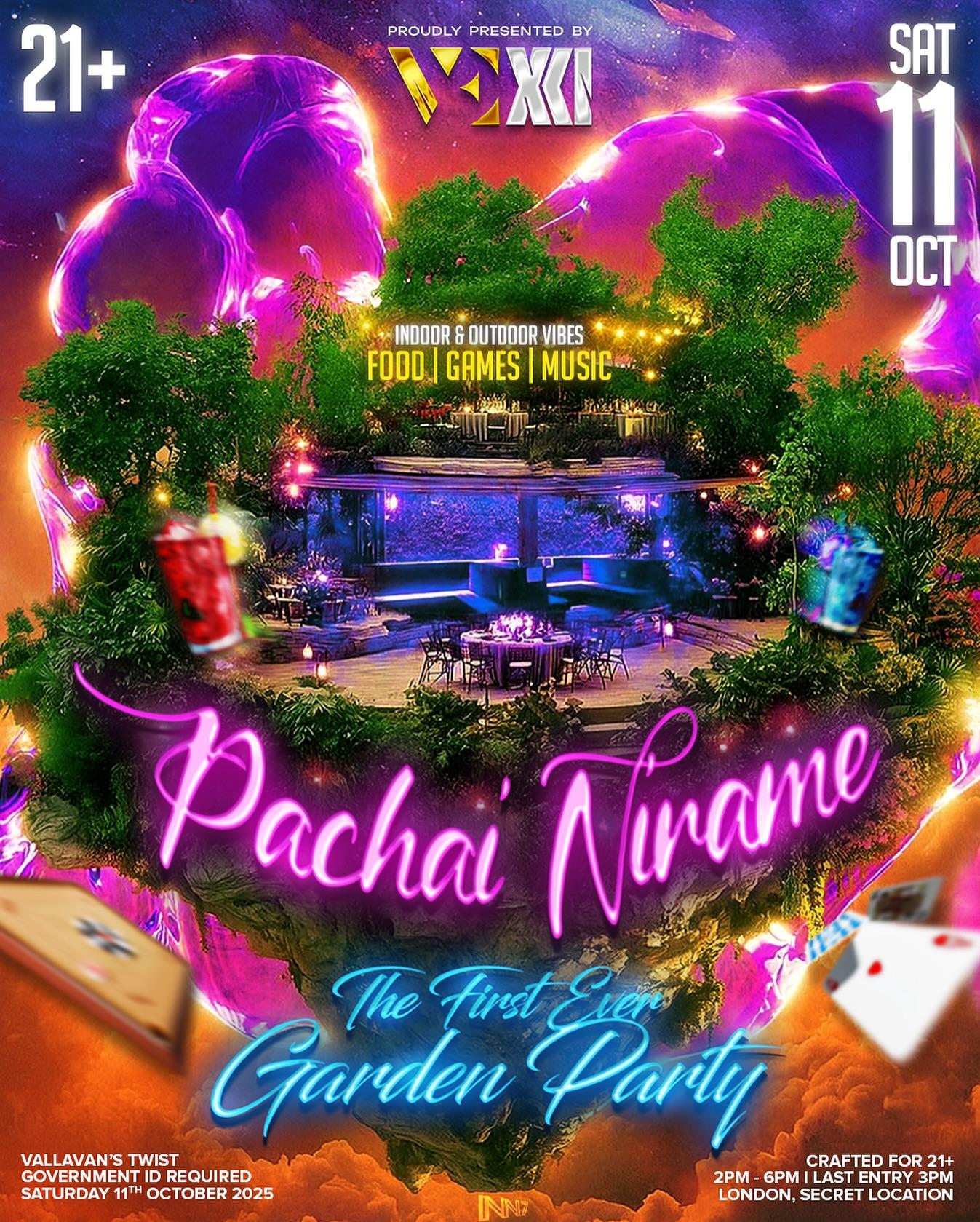 Escape the typical freshers' chaos and late-night club scenes. Pachai Nirame brings you London's first-ever Tamil garden party designed specifically for the 21+ crowd.